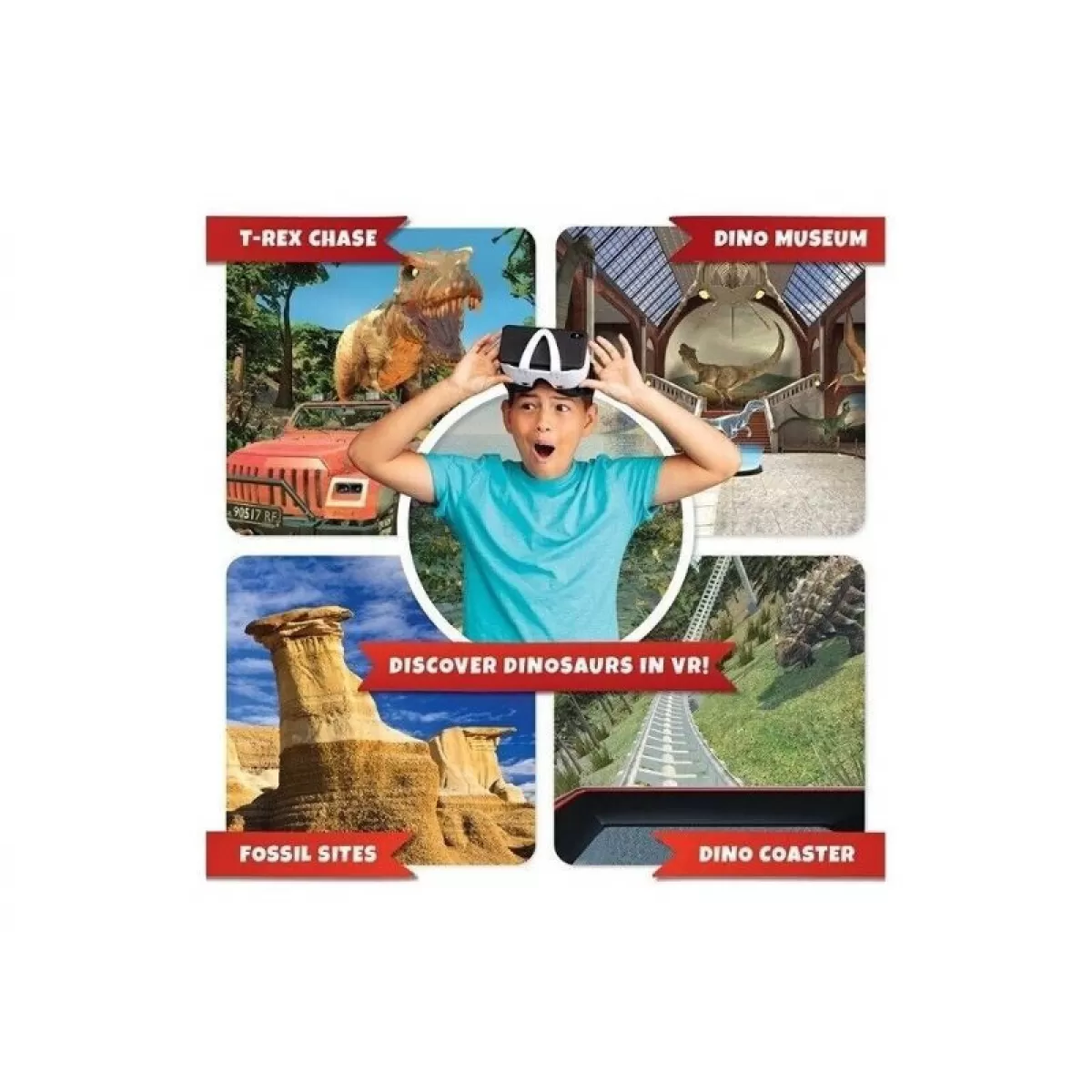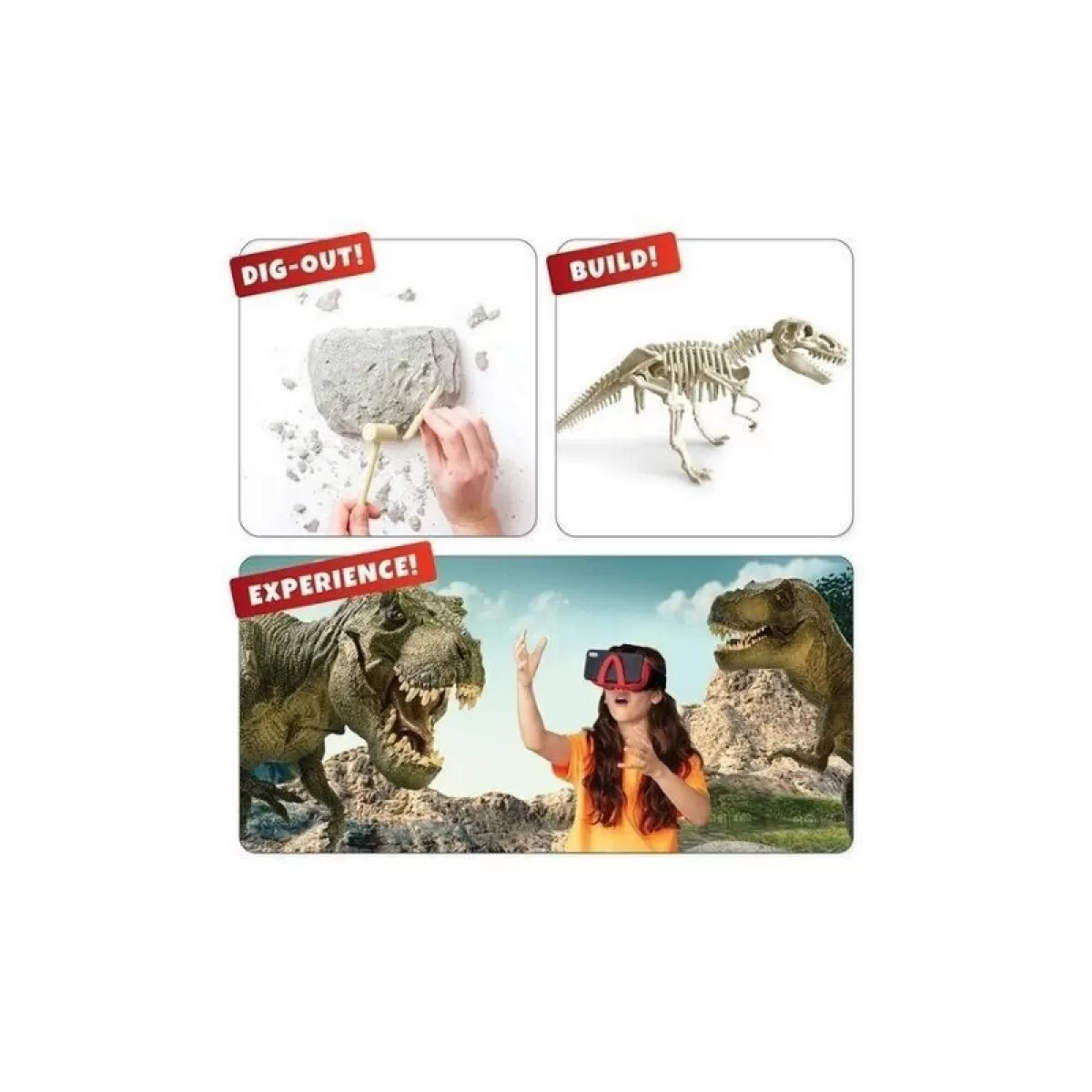 Εξερευνήστε τον εκπληκτικό κόσμο των δεινοσαύρων σε εκπληκτική εικονική πραγματικότητα! Το σετ Dino Dig VR περιλαμβάνει βράχο εκσκαφής, σκαπτικά εργαλεία για ανασκαφή και συναρμολογούμενο σκελετό δεινοσαύρου T-Rex