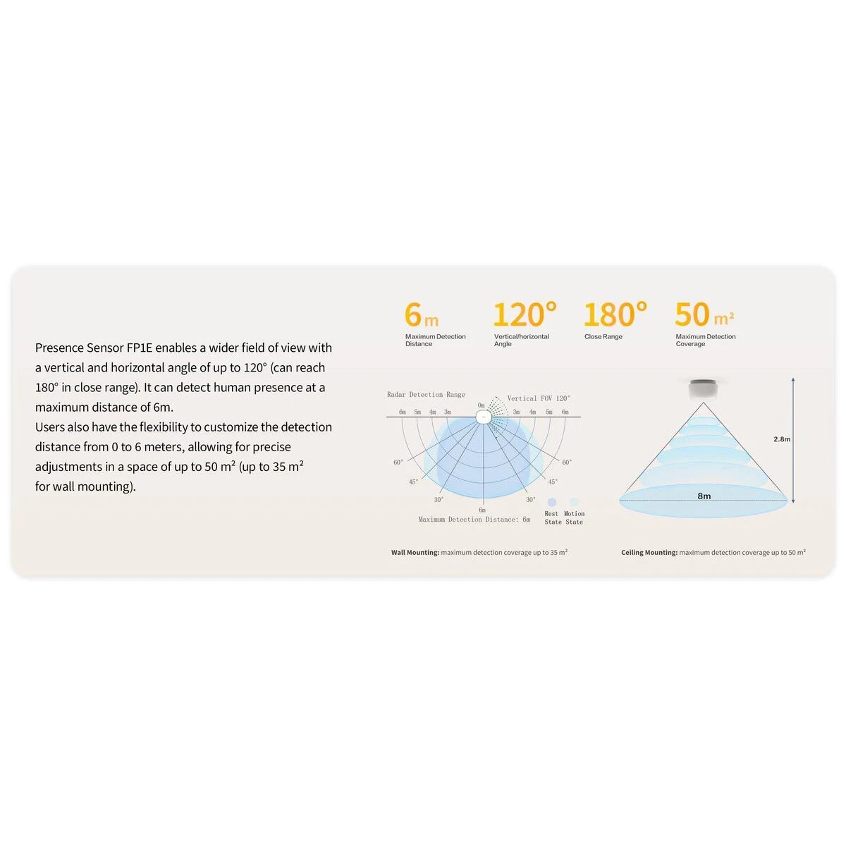 Εξαιρετικά ακριβής αισθητήρας mmWave Radar: Εξοπλισμένος με προηγμένη τεχνολογία mmWave Radar, το FP1E ξεπερνά τους παραδοσιακούς αισθητήρες PIR σε ευαισθησία και ταχύτητα, ανιχνεύοντας λεπτές κινήσεις με χρόνο απόκρισης 200 ms. Προσφέρει ευρύ, ρυθμιζόμενο οπτικό πεδίο 120°, καλύπτοντας έως και 50 m² για εγκαταστάσεις οροφής και 35 m² για πλευρικές εγκαταστάσεις, εξασφαλίζοντας ολοκληρωμένη και προσαρμόσιμη παρακολούθηση για διάφορα οικιακά περιβάλλοντα.