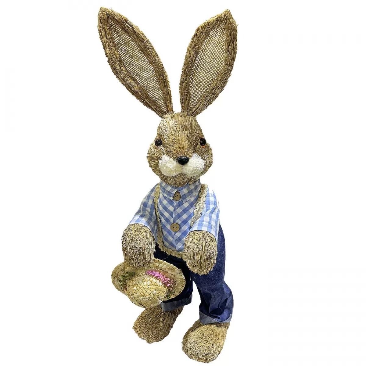 Λαγός όρθιος μπλε πουκάμισο ψάθινος κρατάει καπέλο 60x21x20cm Bunny's 932179
