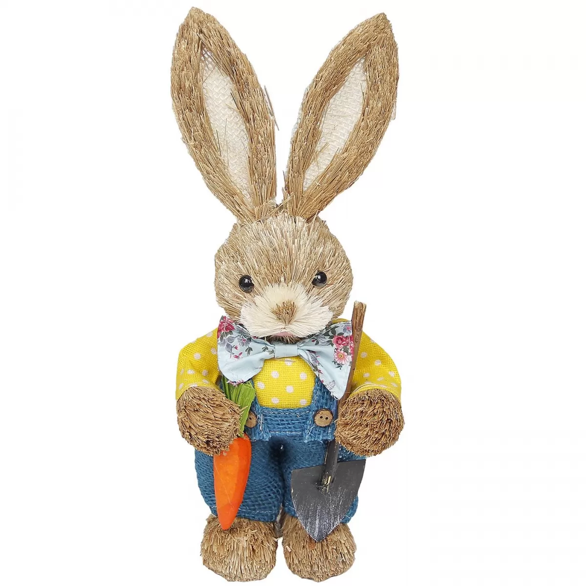 Λαγός όρθιος ψάθινος με μπλε παντελόνι κρατάει φτυάρι και καρότο 33x13x10cm Bunnys 932182
