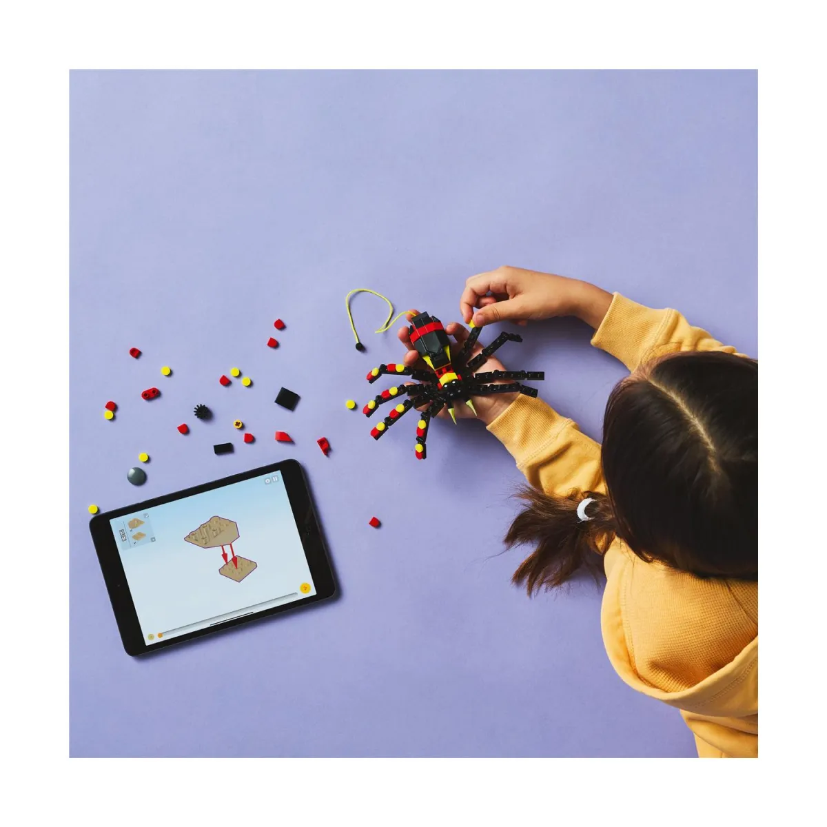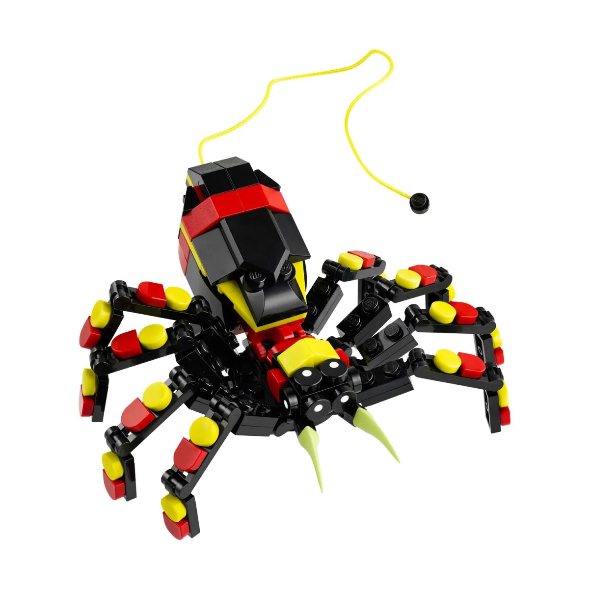 Σετ αράχνης LEGO® για παιχνίδι και έκθεση – Οι φιγούρες ζώων μπορούν να εκτίθενται μετά το παιχνίδι και τα παιδιά μπορούν να βγάλουν έναν φωτεινό κίτρινο ιστό από την πλάτη της αράχνης για να τον κρεμάσουν από ένα τουβλάκι LEGO.