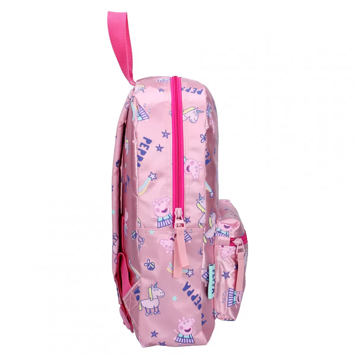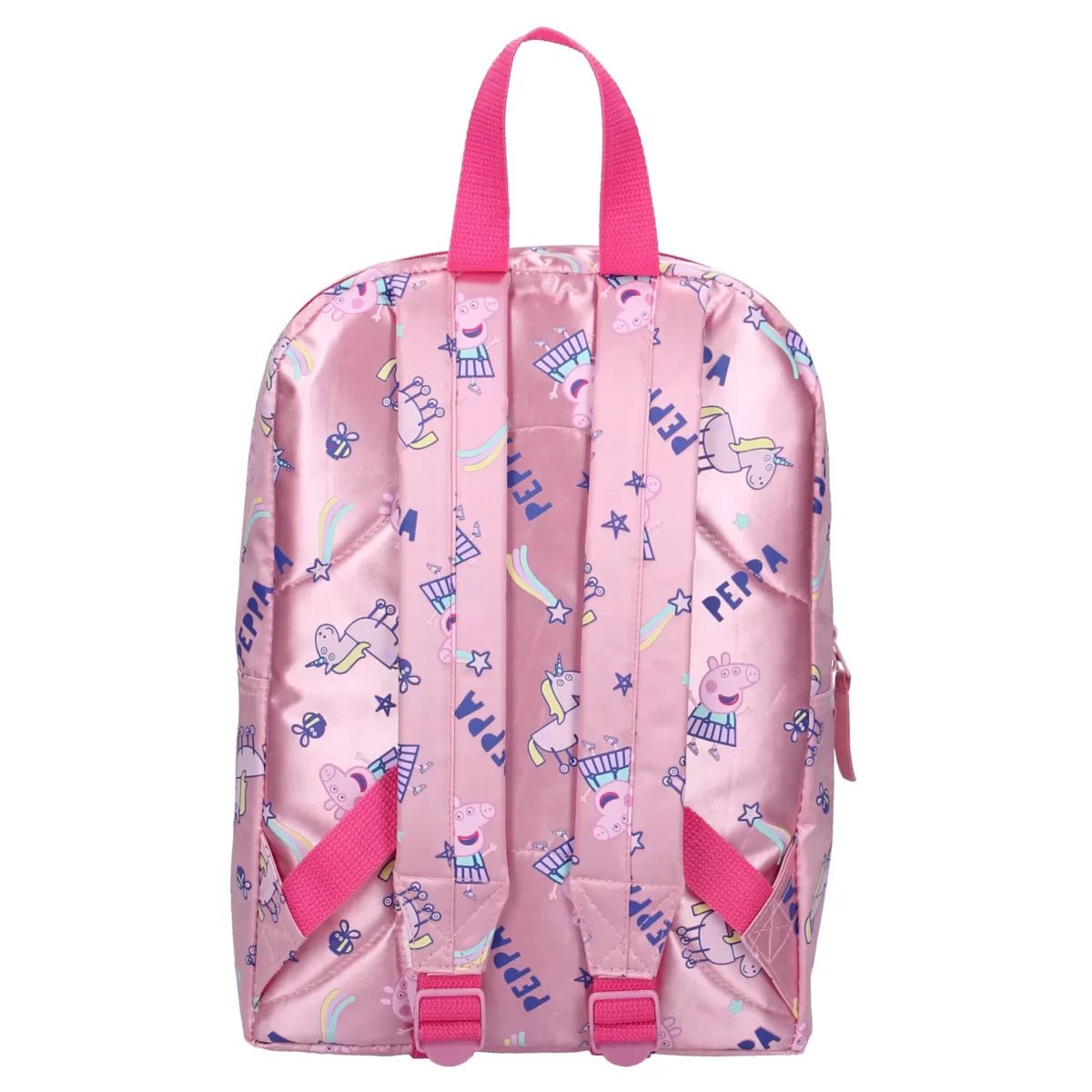 Διασκεδάστε με αυτό το ροζ σακίδιο Peppa Pig! Το σακίδιο είναι κατασκευασμένο από πολυεστέρα. Η τσάντα διαθέτει πολλές εικόνες Peppa Pig, μονόκερους και ουράνια τόξα. Η τσάντα έχει μια ευρύχωρη κύρια θήκη και μια μικρή μπροστινή τσέπη, οι οποίες κλείνουν και οι δύο με φερμουάρ. Οι ιμάντες ώμου ρυθμίζονται σε μήκος.