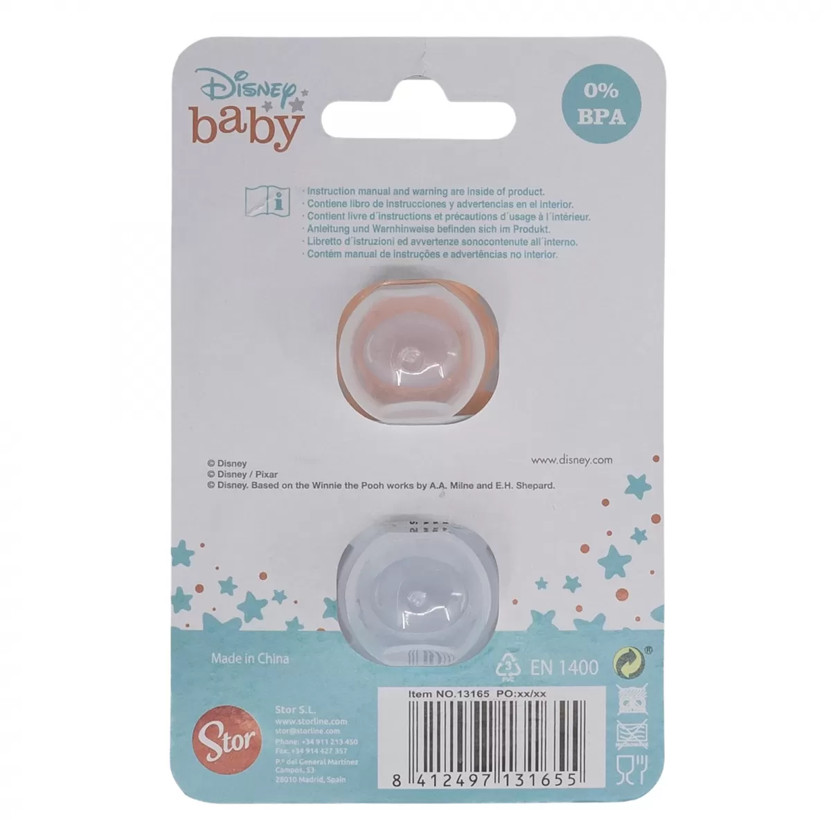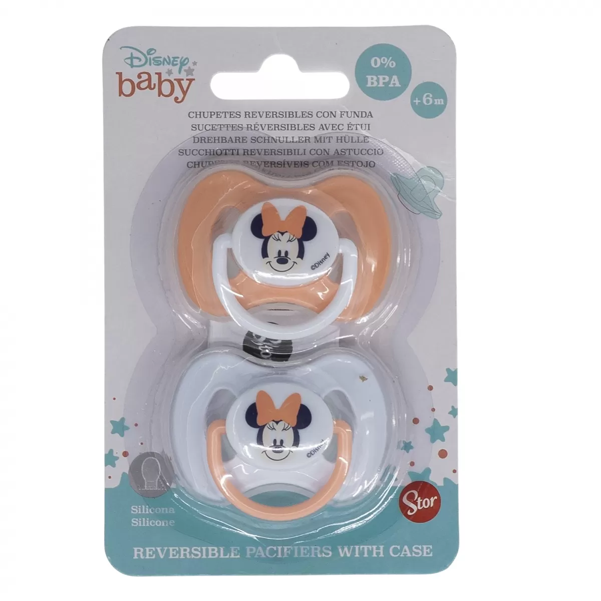Συσκευασία με δύο αναστρέψιμες πιπίλες με μεγάλη θηλή φυσιολογικής σιλικόνης (6 μηνών και άνω). Διακοσμημένο με πρωτότυπα σχέδια, βασισμένα σε μερικούς από τους πιο διάσημους κινηματογραφικούς και τηλεοπτικούς χαρακτήρες.