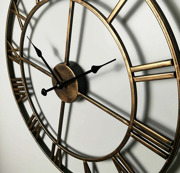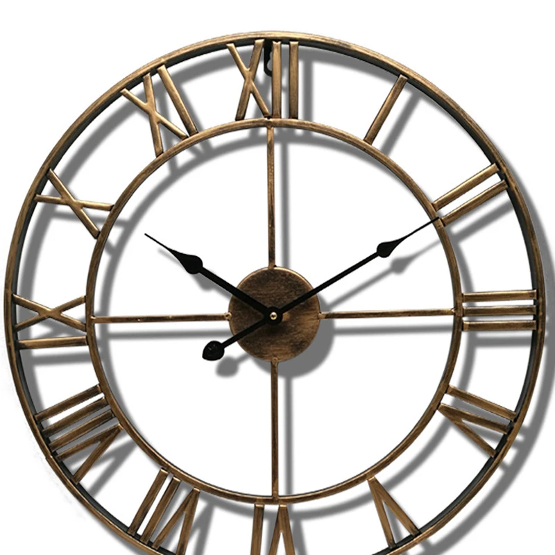 58CM Nordic Metal Roman Numeral Wall Clocks Retro Iron Round Face Gold Large Outdoor Garden Clock Home Decoration
