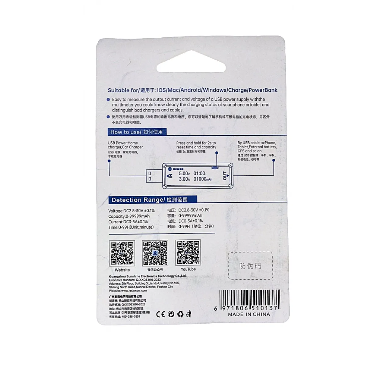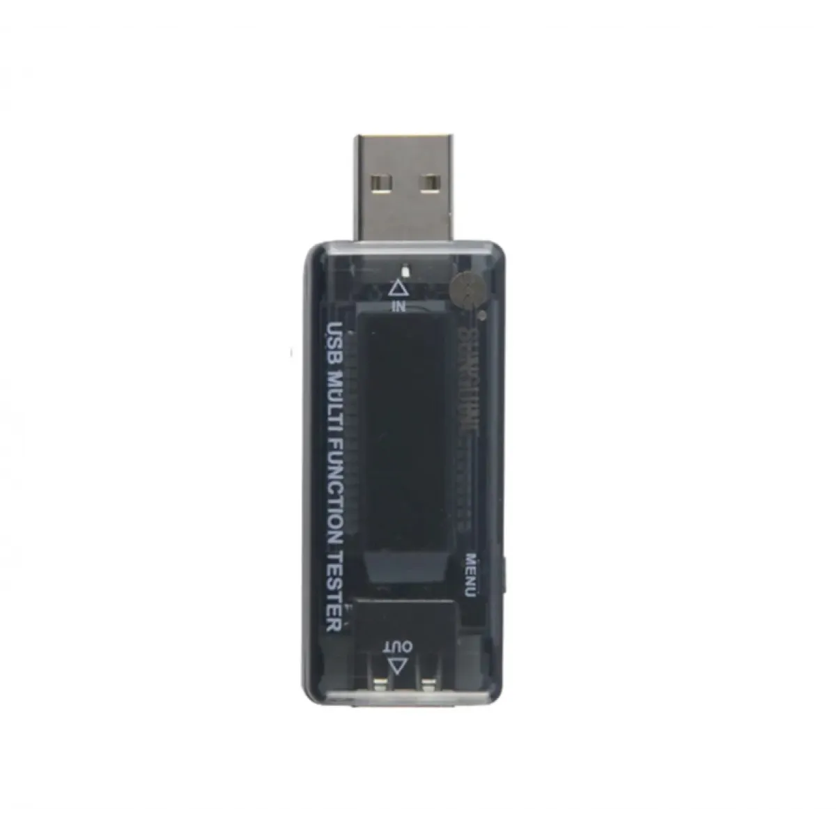 USB tester για τον έλεγχο της φόρτισης συσκευών που φορτίζουν μέσω θύρας USB. Η είσοδος USB συνδέεται με φορτιστή τοίχου ή αυτοκινήτου και η έξοδος USB με το καλώδιο φόρτισης. Διαθέτει ευανάγνωστη οθόνη που εμφανίζει σε πραγματικό χρόνο τα Voltage και Ampere εξόδου, τον χρόνο φόρτισης και την χωρητικότητα της μπαταρίας.