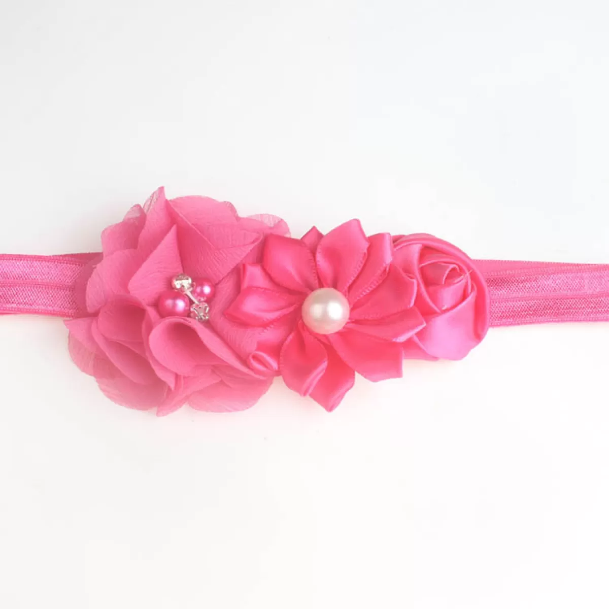 Βρεφική κορδέλα φούξια με λουλούδια και μαργαριτάρι